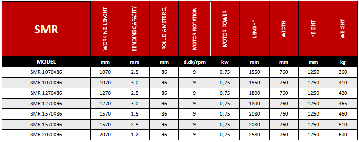 Les modèles SMR / SMK sont conçus pour répondre aux besoins des applications légères, avec un fonctionnement manuel fiable et une grande robustesse. Ils conviennent très bien aux ateliers recherchant une solution classique et durable pour le cintrage de tôles de faible épaisseur.